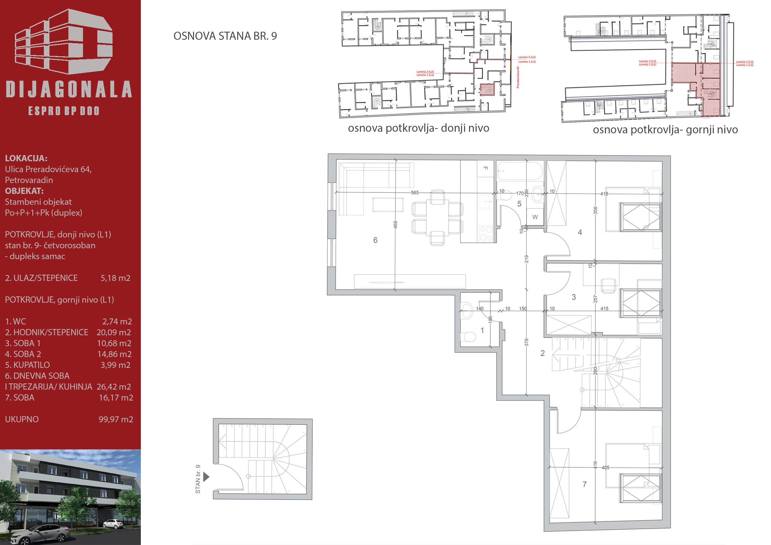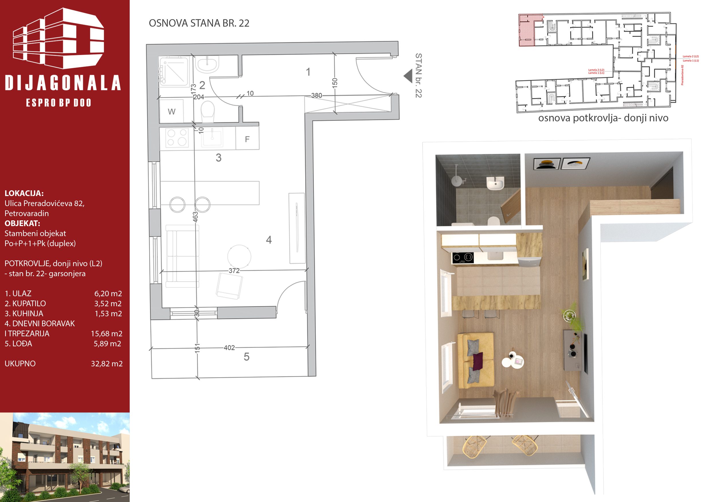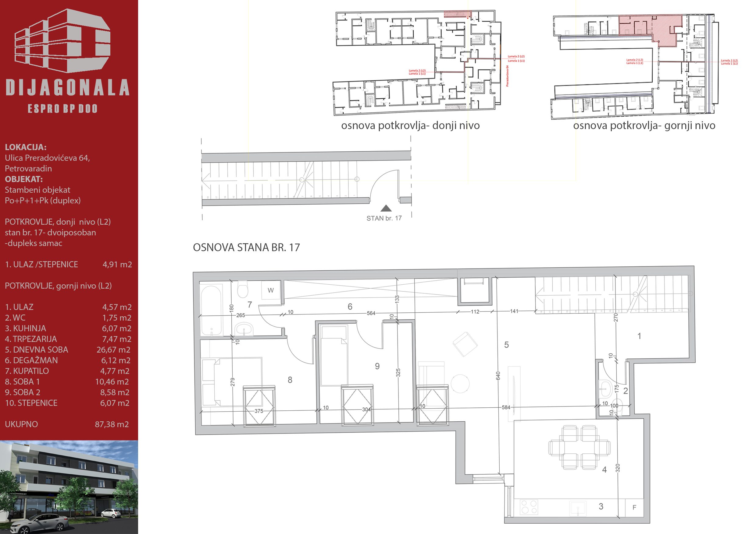 U Petrovaradinu, u glavnoj, Preradovićevoj, ulici gradimo višeporodični stambeni objekat sa 39 stambenih jedinica, od kojih se u ovom ulazu nalazi 22. Objekat je spratnosti Po+P+1+Pk (ima duplekse), a u ovom ulazi ima i 1 lokal u prizemlju.