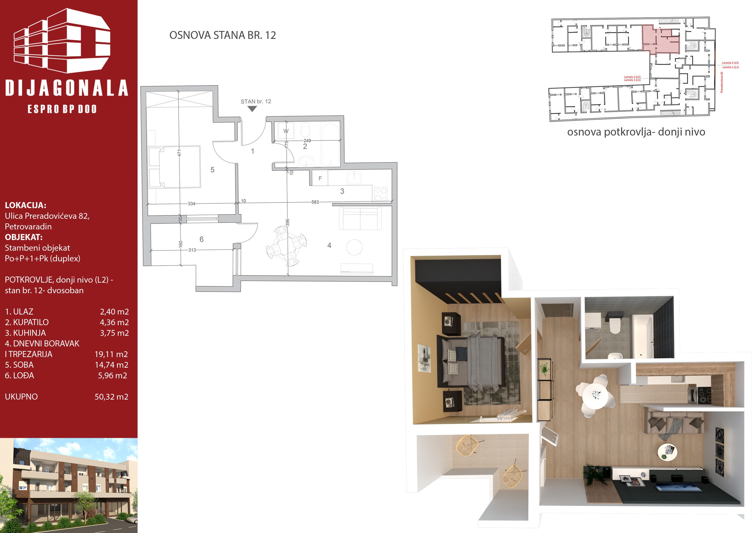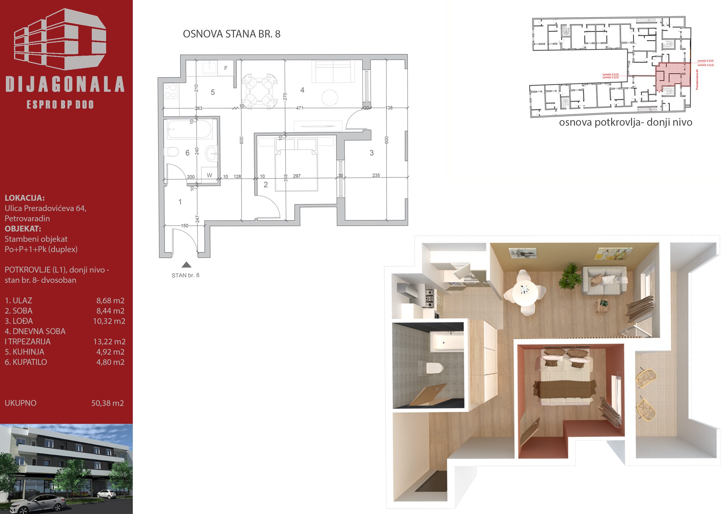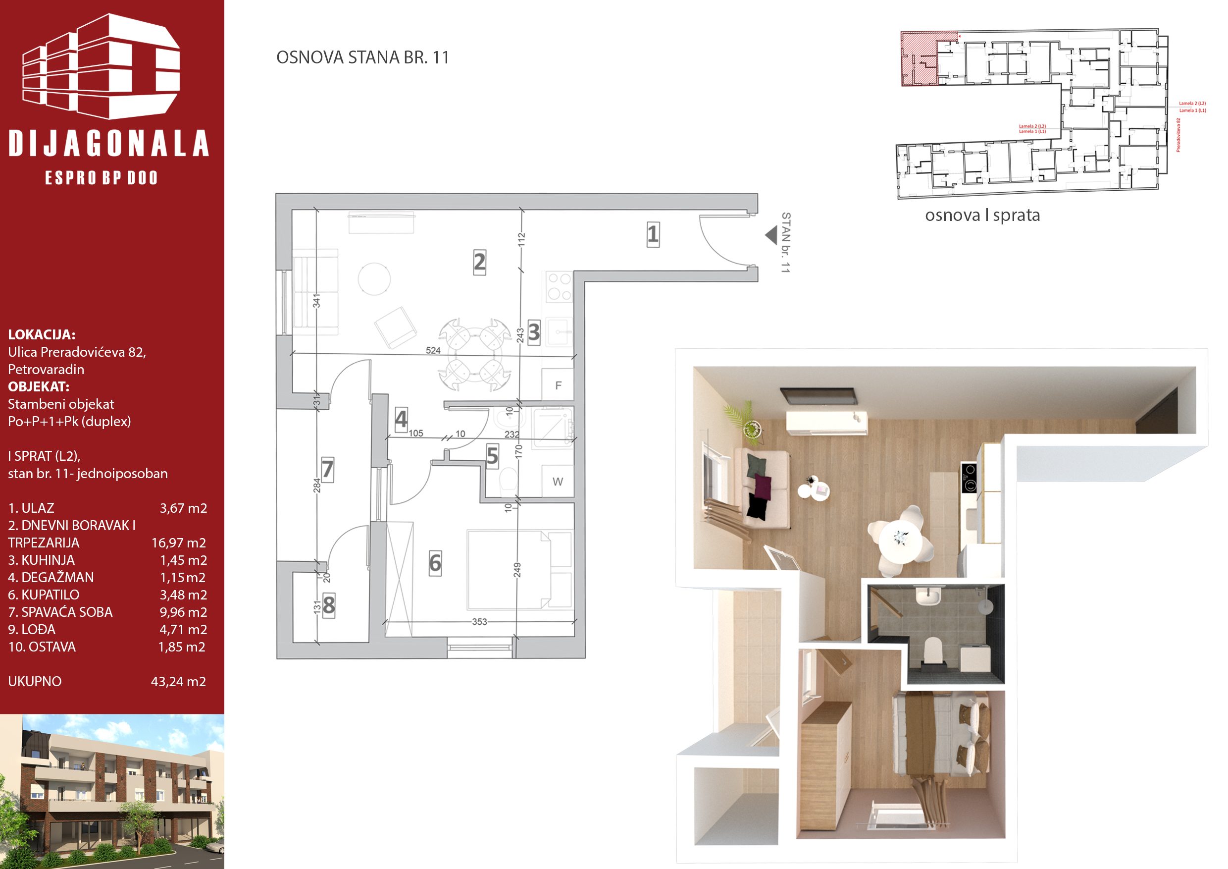 U Petrovaradinu, u glavnoj, Preradovićevoj, ulici gradimo višeporodični stambeni objekat sa 39 stambenih jedinica, od kojih se u ovom ulazu nalazi 22. Objekat je spratnosti Po+P+1+Pk (ima duplekse), a u ovom ulazi ima i 1 lokal u prizemlju.