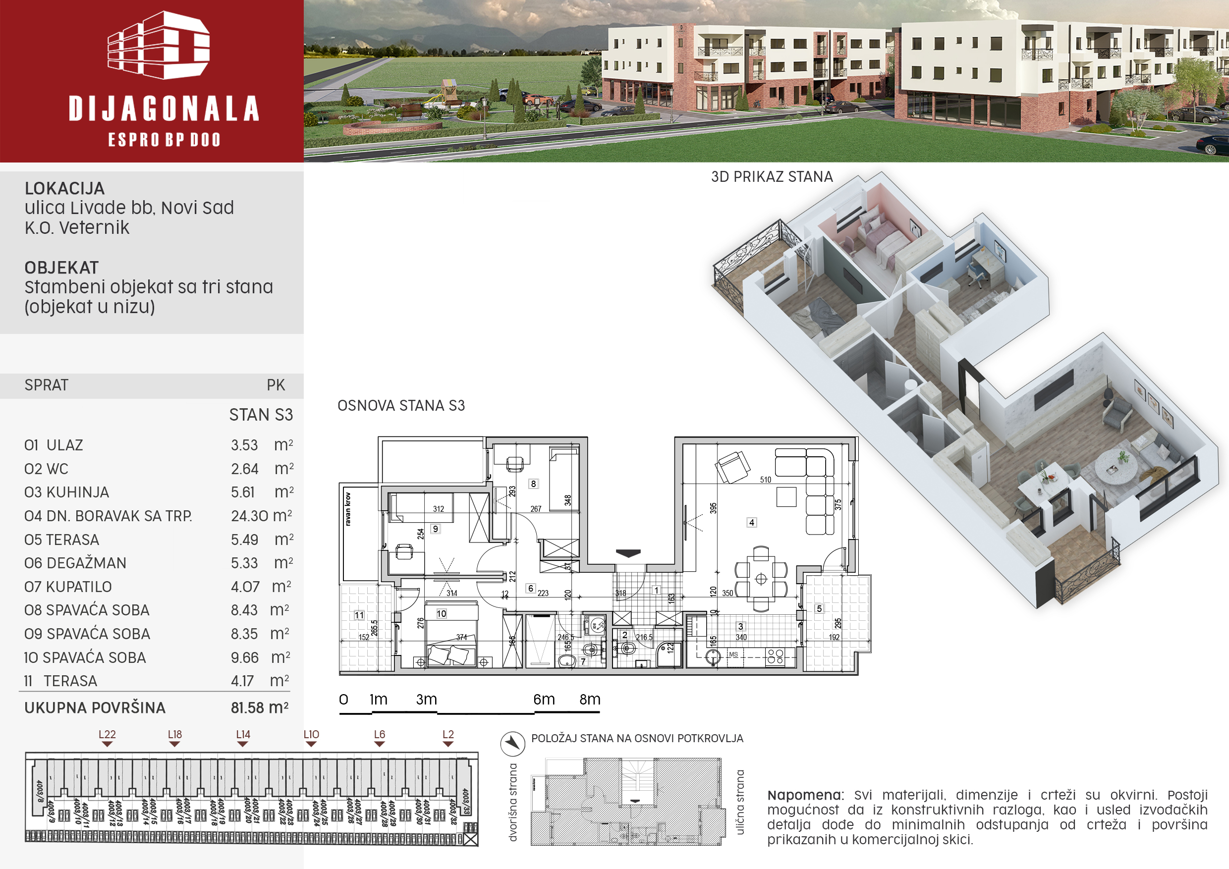Projektovane površine 37,46 m2, na prvom spratu, ulično orjentisan, jednoiposoban po strukruri, sa terasom, u stanu je laminat, keramika I klase, ugradne sanitarije, petokomorna pvc stolarija sa roletnama (spolja antracit siva folija), sobna vrata medijapan, grejanje podno na toplotne pumpe.
