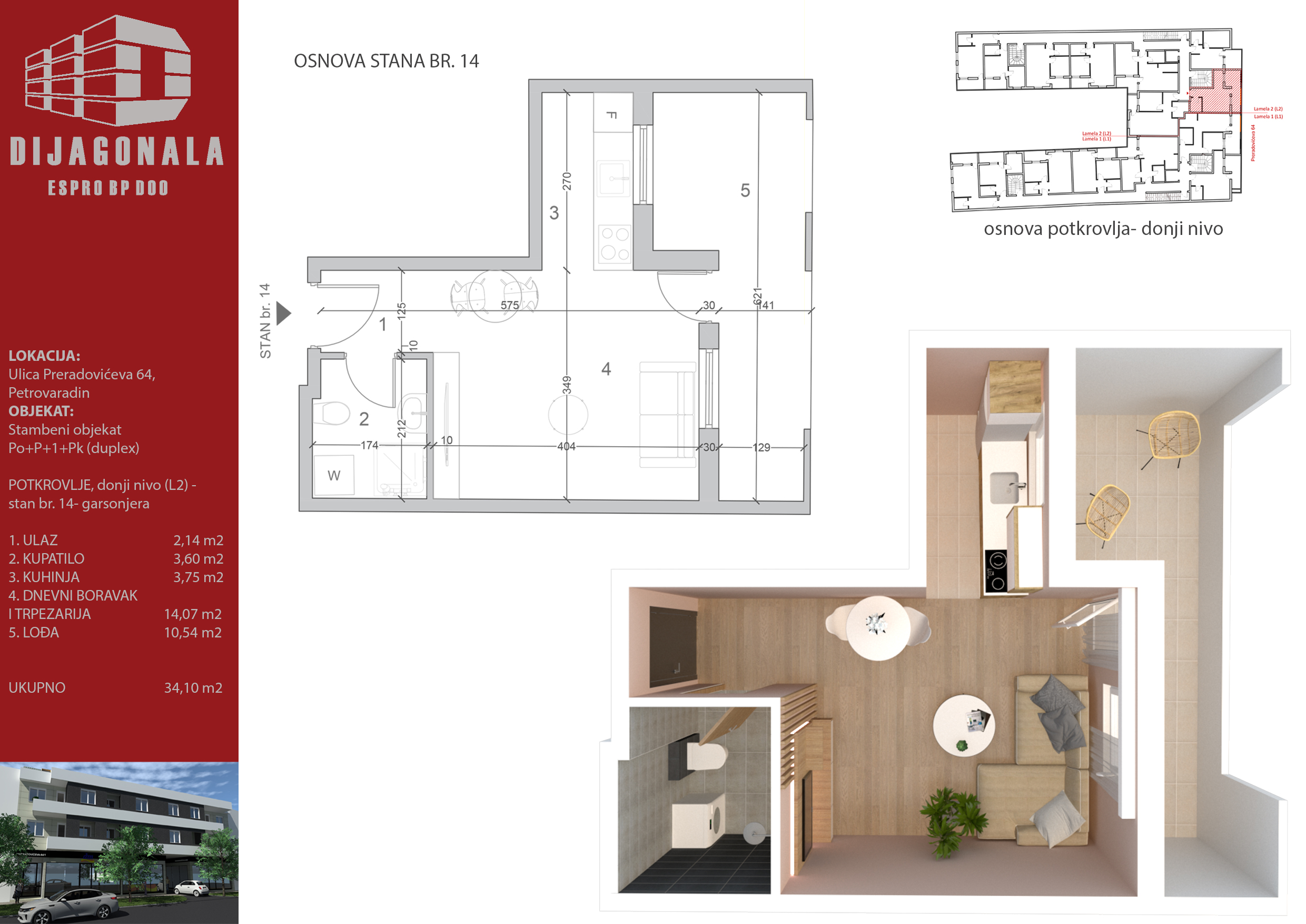 U Petrovaradinu, u glavnoj, Preradovićevoj, ulici gradimo višeporodični stambeni objekat sa 39 stambenih jedinica, od kojih se u ovom ulazu nalazi 22. Objekat je spratnosti Po+P+1+Pk (ima duplekse), a u ovom ulazi ima i 1 lokal u prizemlju.