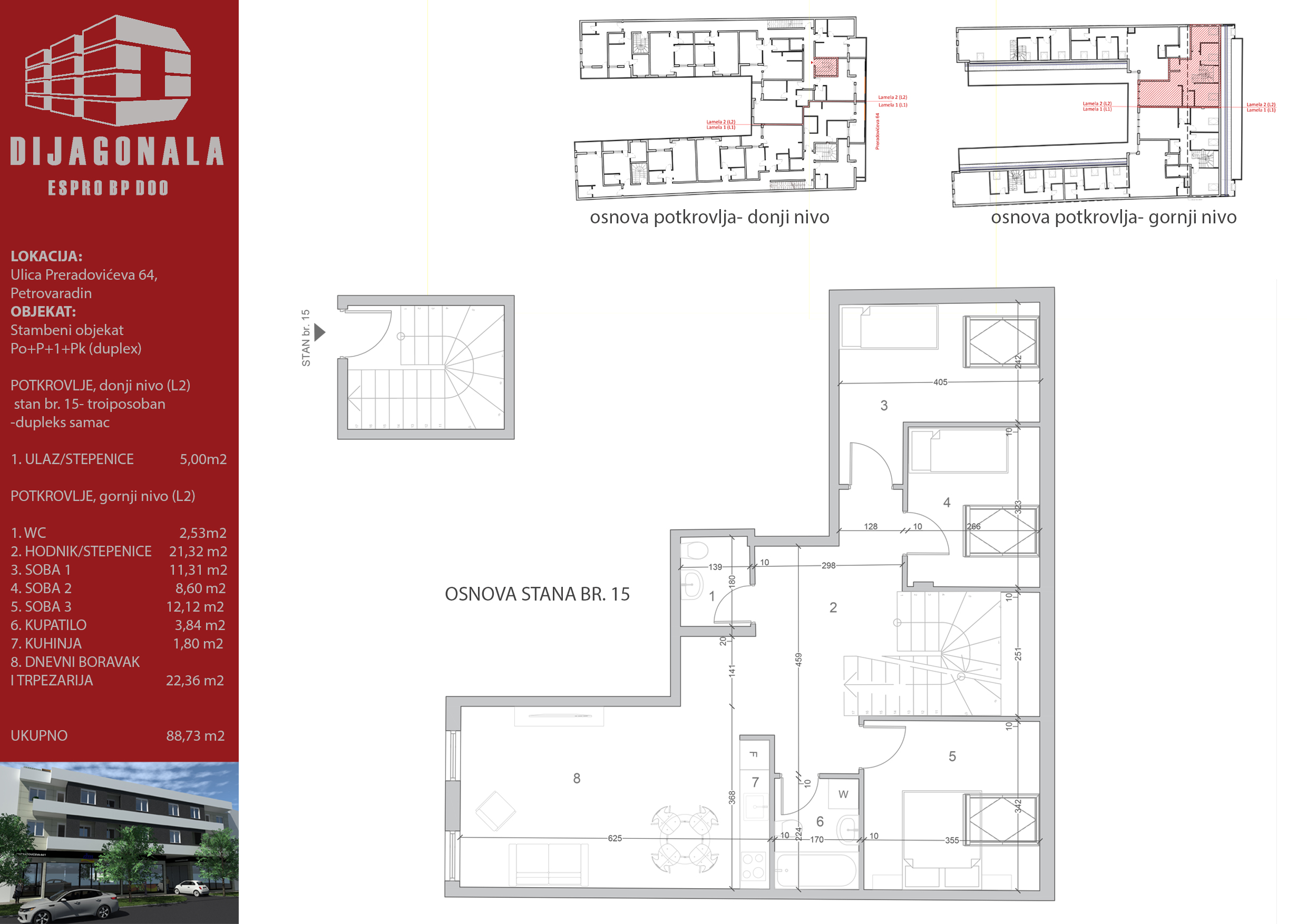 U Petrovaradinu, u glavnoj, Preradovićevoj, ulici gradimo višeporodični stambeni objekat sa 39 stambenih jedinica, od kojih se u ovom ulazu nalazi 22. Objekat je spratnosti Po+P+1+Pk (ima duplekse), a u ovom ulazi ima i 1 lokal u prizemlju.