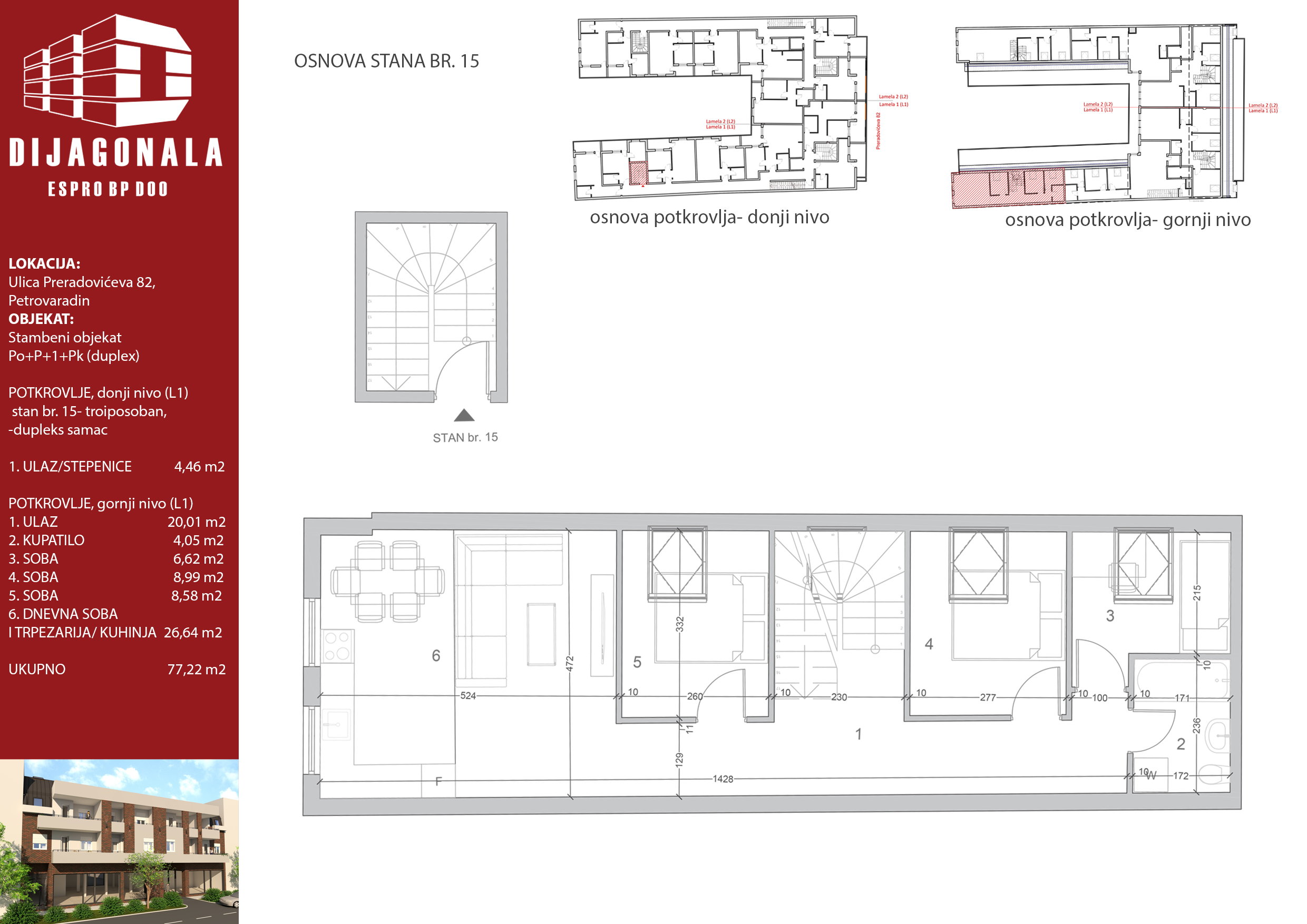 Na ovoj stranici predstavljamo vam prvi od dva ulaza ovog građevinskog projekta, koji se nalazi na veoma interesantnoj lokaciji. Objekat se sastoji od 17 stambenih jedinica, raspoređenih na svega dva nivoa – prvom spratu i ppotkrovlju. U prizemlju se nalaze samo poslovni prostori, pa ukoliko ste zainteresovani za njih, kontaktirajte nas za direktan dogovor.