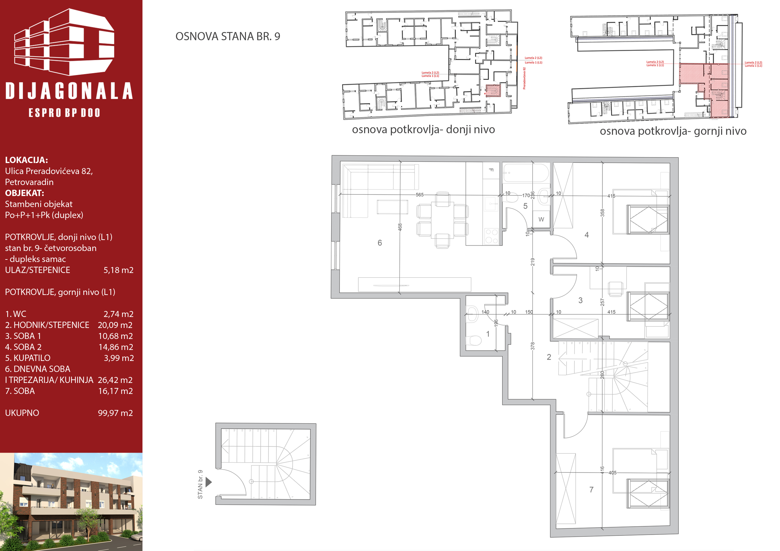 Na ovoj stranici predstavljamo vam prvi od dva ulaza ovog građevinskog projekta, koji se nalazi na veoma interesantnoj lokaciji. Objekat se sastoji od 17 stambenih jedinica, raspoređenih na svega dva nivoa – prvom spratu i ppotkrovlju. U prizemlju se nalaze samo poslovni prostori, pa ukoliko ste zainteresovani za njih, kontaktirajte nas za direktan dogovor.